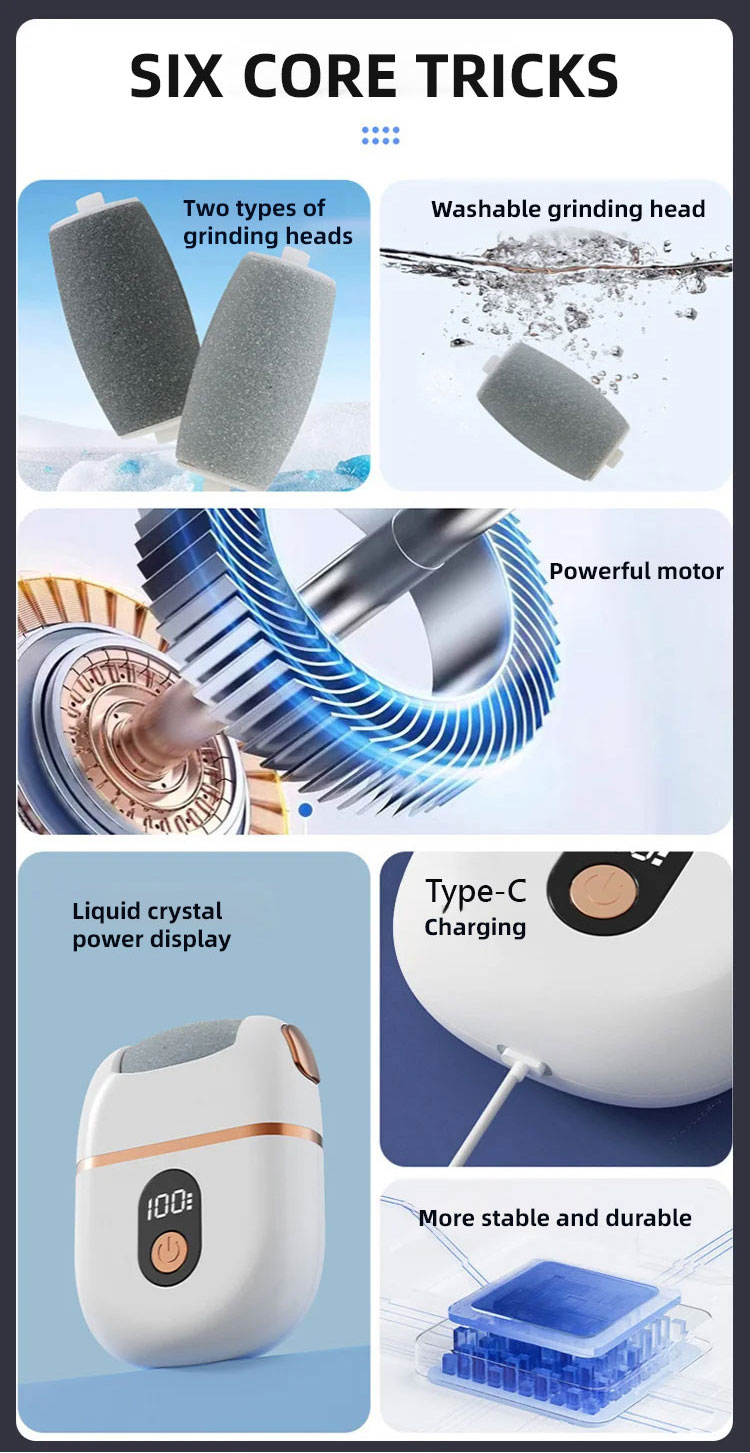 ⚙️🛡️ Industrial Power, Gentle Touch |High-performance silent motor paired with a high-frequency quartz grinding head. It targets tough calluses precisely while keeping skin safe and smooth.🌡️🎚️ Multi-Speed Control |Adjustable speed settings put you in control. Customize your "Foot SPA" experience from gentle care to deep🕊️✍️ Ergonomic Mastery |Ergonomically designed handle for a comfortable, non-slip grip. Making foot beauty treatment completely effortless.🌍🔋 Long-Lasting & Portable |Rechargeable design with long battery life. Minimalist and stylish, it’s the perfect travel companion for home, office, or trips.🌊💆 Pressure Relief & Care |Soothes sole pressure and revitalizes tired feet. Go from deep cleaning to smooth maintenance in one simple routine.